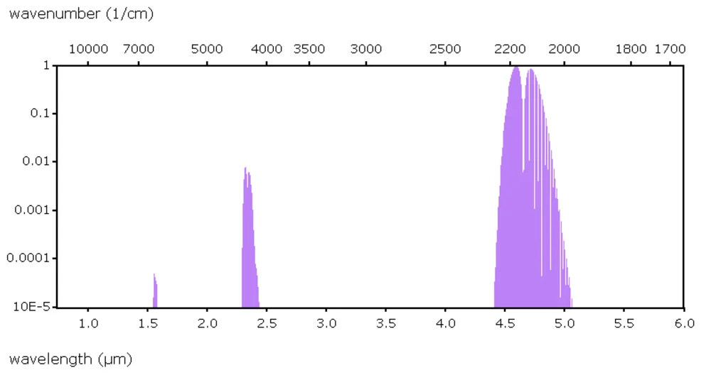 The literature recommends several options. They are illustrated in the graphic on the right, which shows the relative intensities of the possible absorption lines. To define the most suitable CO wavelength for your application, you may have a look at our literature recommendations below or refer to the HITRAN database from the Smithsonian Institute.