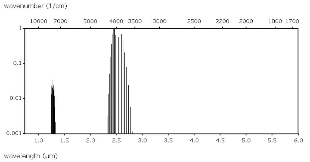 The literature recommends several options. They are illustrated in the graphic on the right, which shows the relative intensities of the possible absorption lines. To define the most suitable HF wavelength for your application, you may have a look at our literature recommendations below or refer to the HITRAN database from the Smithsonian Institute.