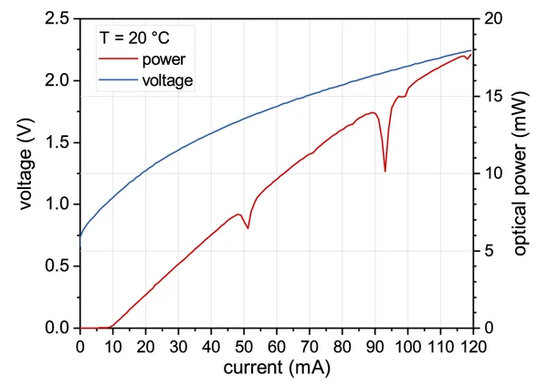 Typical power, current and voltage characteristics of a nanoplus 1877 nm distributed feedback laser diode