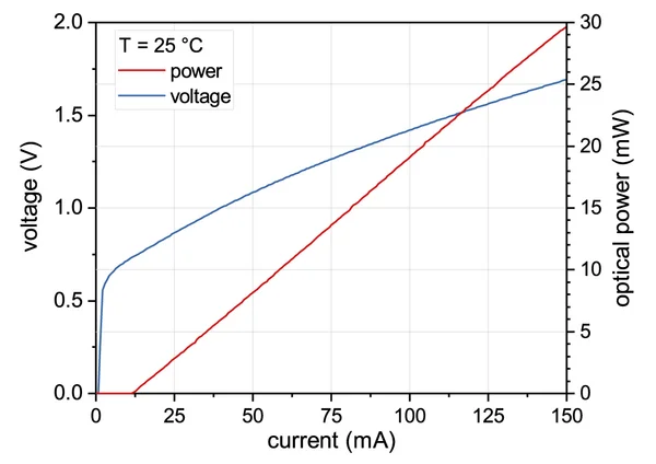 Typical power, current and voltage characteristics of a nanoplus 2004 nm distributed feedback laser diode