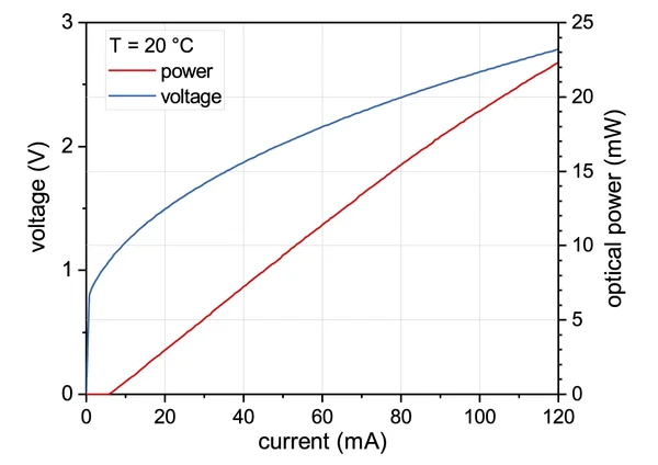 Typical power, current and voltage characteristics of a nanoplus 2334 nm distributed feedback laser diode