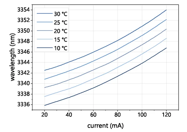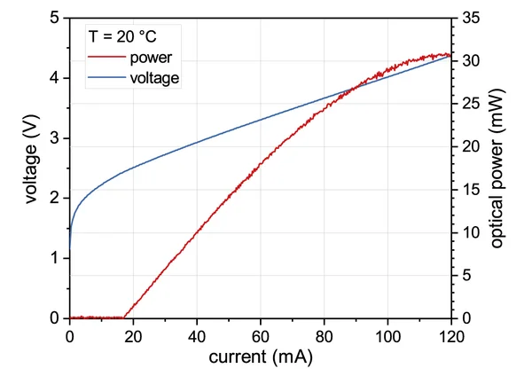 Typical power, current and voltage characteristics of a nanoplus 3345 nm distributed feedback interband cascade laser