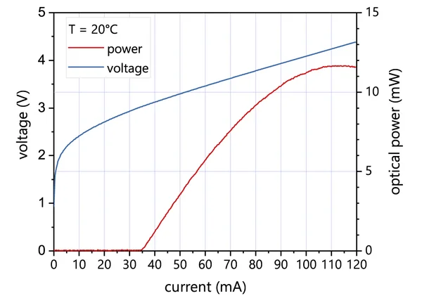 Typical power, current and voltage characteristics of a nanoplus 4524 nm distributed feedback interband cascade laser