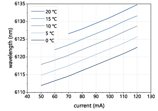 Typical mode hop free tuning of a nanoplus 6125 nm distributed feedback interband cascade laser