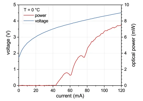 Typical power, current and voltage characteristics of a nanoplus 6125 nm distributed feedback interband cascade laser