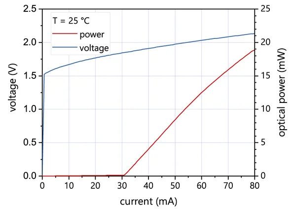 Typical power, current and voltage characteristics of a nanoplus 852 nm distributed feedback laser diode