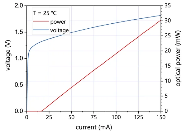 Typical power, current and voltage characteristics of a nanoplus 1064 nm distributed feedback laser diode