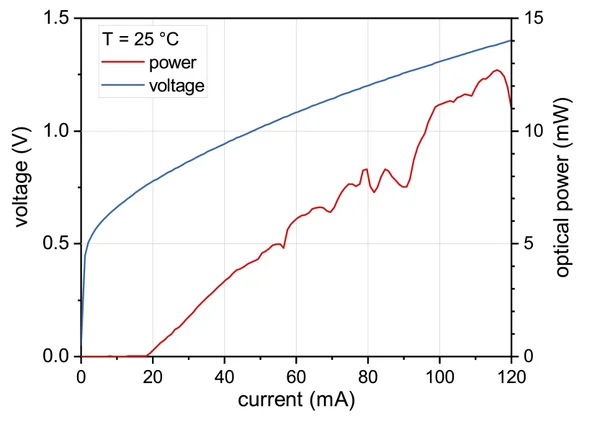 Typical power, current and voltage characteristics of a nanoplus 2700 nm Fabry-Pérot laser diode
