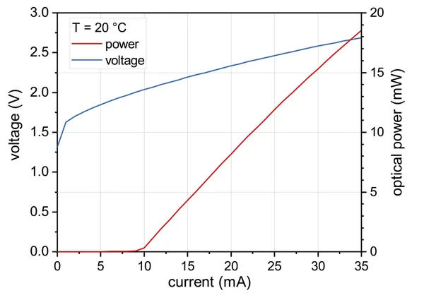 Typical power, current and voltage characteristics of a nanoplus 761 nm Fabry-Pérot laser diode