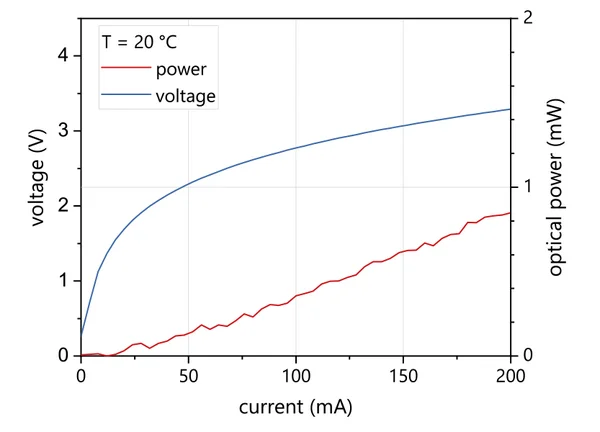 Typical power, current and voltage characteristics of a nanoplus 5.1 µm mid-infrared LED