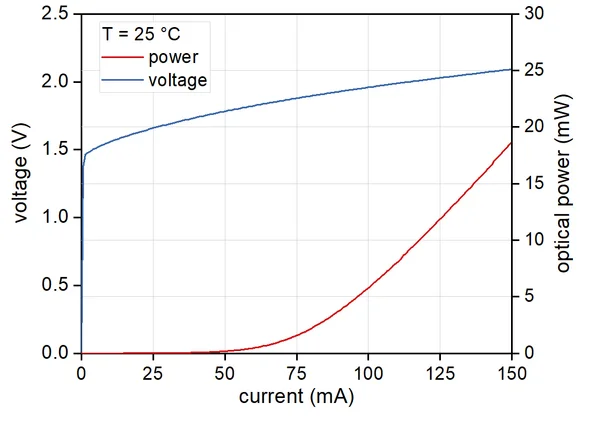 Typical power, current and voltage characteristics of a nanoplus 850 nm superluminescent diode